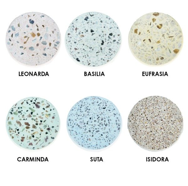 Cada pieza está hecha a mano, con un acabado en terrazo que presenta patrones y colores únicos, asegurando que sea verdaderamente exclusiva.