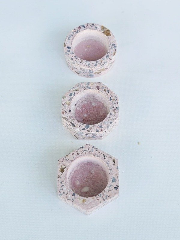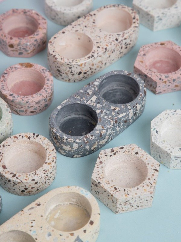 Cada portavelas está elaborado a mano, presentando patrones y colores únicos en el terrazo que lo hacen una pieza única. Variedad de combinaciones y tonos que se adaptan a cualquier estilo de decoración.